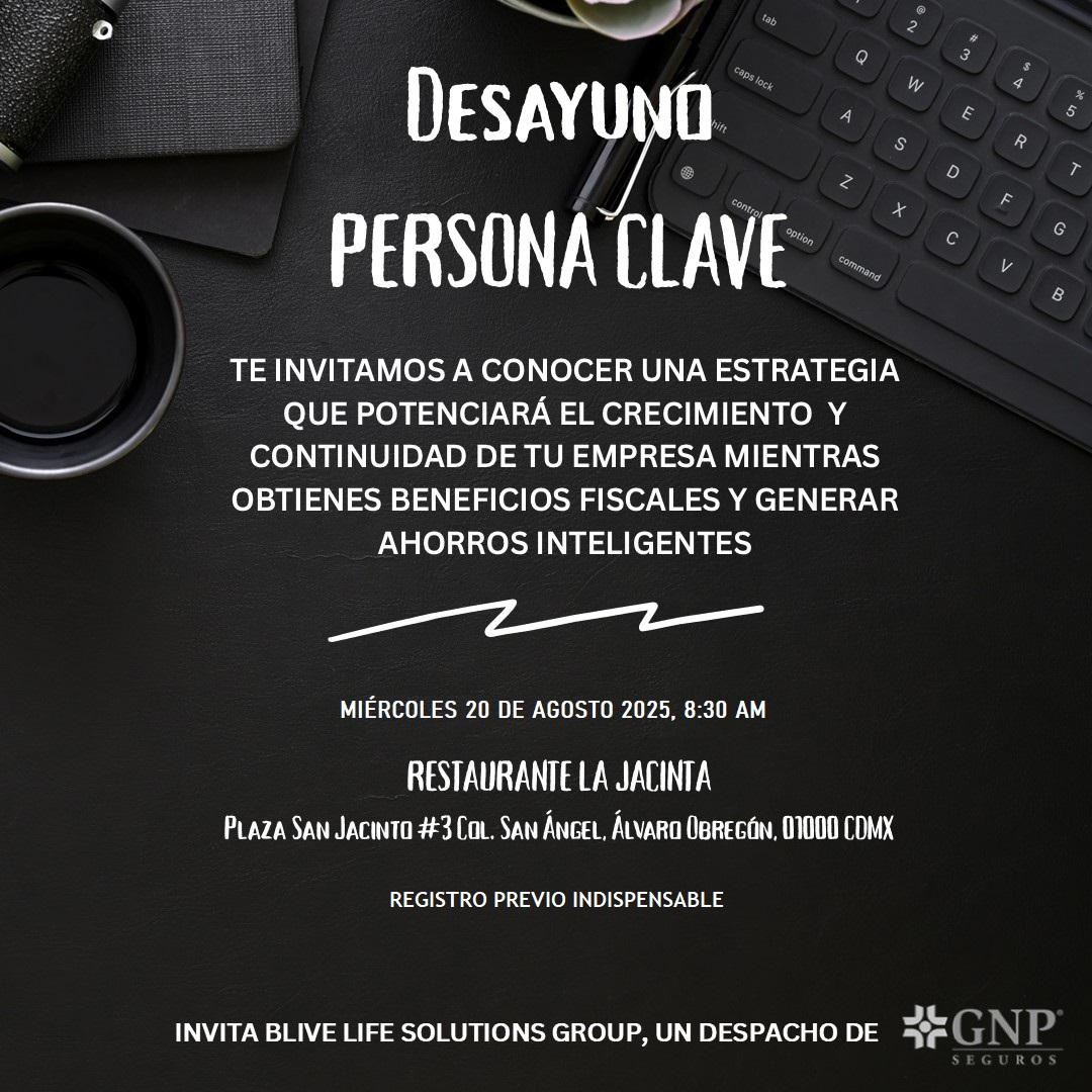 El evento se llevará a cabo en el Restaurante La Jacinta San Ángel y tiene como objetivo concientizar a los asistentes sobre la importancia de implementar la estrategia de «Persona Clave», los beneficios que está tiene y los riesgos que corren las empresas y sus socios por no contar con este tipo de protección.