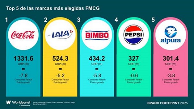 El informe Brand Footprint 2025 de Worldpanel by Numerator revela el ranking de las marcas de bienes de consumo masivo más elegidas por los compradores en México. Las cinco marcas principales de este año son Coca-Cola, Lala, Bimbo, Pepsi y Alpura, con la ayuda de nuevos hogares compradores de la marca se encuentran dentro del Top 5.